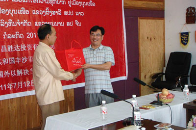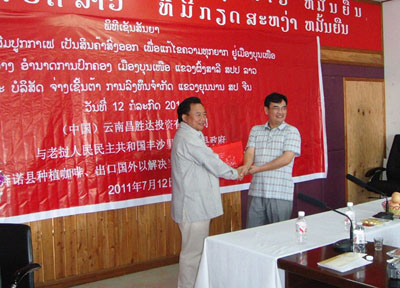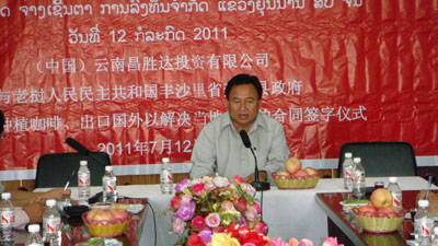 据公司实地考察,老挝丰沙里省极其适宜咖啡栽培和生产优质咖啡。经过半年与老挝丰沙里省政府和奔诺县政府的洽谈和协商,双方于2011年7月12日在老挝丰沙里奔诺县达成共识并举行咖啡项目的合同签约仪式。公司董事长尹新华先生、总经理吴建新先生和董事长助理黄娟小姐、翻译信塔威,老挝丰沙里省计划厅、农林厅、商务厅、环保厅、土地厅、公安厅的厅长或副厅长会同奔诺县县政府相关部门的主要领导出席了此次签约仪式。丰沙里计划投资厅的外国投资处处长——塔王主持会议,计划投资厅厅长发表了重要讲话,强调了双方开展合作的重要意义,并对我公司的咖啡投资项目给予了高度评价。签字仪式的成功举行,意味着双方的合作关系迈入了新的里程碑,标志着云南昌胜达投资有限公司老挝子公司——“昌胜达咖啡公司”正式成立,我公司的国外业务将更上一个新台阶。