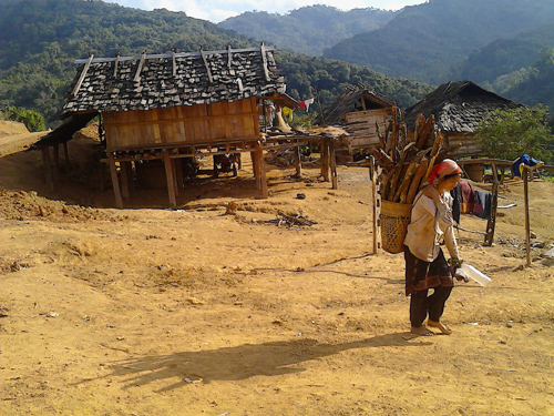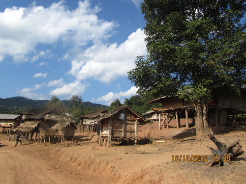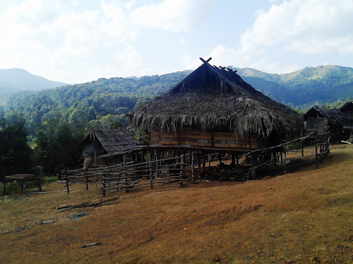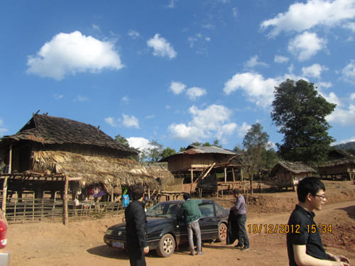 结束种植基地的考察后,我们继续这条泥土路向深山处进发。途中涉过两条潺湲的小溪;在经过大约40多分钟行程后,我们总算到达今天的目的地——朴萨村。也许一直生活在城市中的我们,不能想象,世界上还有这样的地方,因为来到这里就仿佛回到人类最初居住在森林中的自然村落。一砖一瓦在这里已是稀罕物,映入眼帘的大部份房屋都是用木头和茅草搭建的。