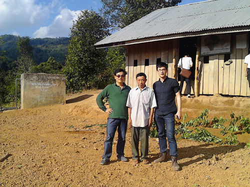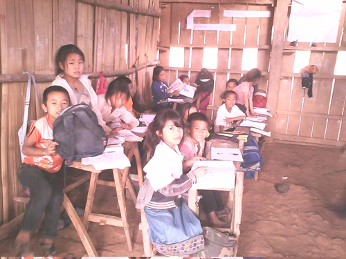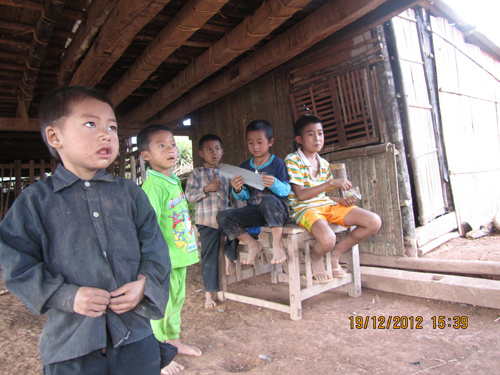 尹新华董事长与朴萨村村长之前便相识,所以他俩通过翻译开启了一段愉快的交谈。尹总首先赞扬了朴萨村在咖啡种植方面的优异成绩,及村民们在这两年,在栽培、管理咖啡树过程中,始终如一的积极的态度和勤劳、朴实的民风,这从他们种植区咖啡树良好的长势就能看出来;然后代表公司对这个咖啡种植村进行了慰问。而这位朴实、谦卑的村长,也代表村民们对公司的到访、慰问和公司为村寨修通道路及提供的各方面帮助,表达了最诚挚的感谢。在经过一番座谈和休息后,我们参观了小学。这个不过有十几户人家、每户人家按6至8人算、总共不过一百多人的小村庄,却几乎把村里最好的一个房子用来作为了小学,因为这个房子房顶上盖着薄薄的石棉瓦。教室只有两间,当我们走到门口向里边一瞧,当场便被震惊了,因为再也没见过比这更简陋的小学!只见地是大山的黄土地,墙是木板搭的,黑板用两棵树丫支着便搭在墙上;那些课桌椅,如果可以忽略最原始的木工,我想与两棵树丫子中间搭着一块板子并没有什么差别。这,就是朴萨村孩子们上课的地方;环眺四围的群山,还有多少这样的小学校呢?