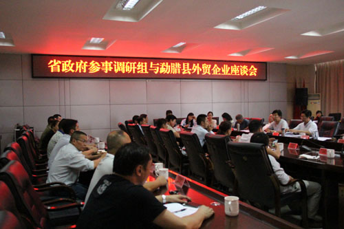 2015年4月23日下午,省政府参事调研组与勐腊县外贸企业座谈会在勐腊县政府会议室举行。调研组花泽飞一行人与各企业代表就企业发展中遇到的问题和困难进行了沟通交流。