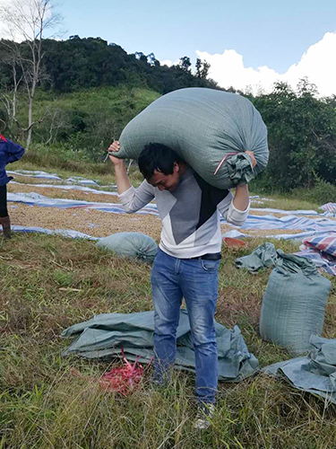 在收购、加工、晾晒咖啡过程中,党员干部带头抱咖啡,称重开单,装、卸咖啡。在加工鲜果时,党员干部主动向生产部同事学习加工技术,操作咖啡脱皮脱胶机,并帮助晾晒、存储咖啡。为及时将鲜果款送至咖农手中,党员干部和同事经常坐着车颠簸五六个小时、跨越山水,逐村逐户地结算咖啡鲜果款。积极配合加工厂建设工作,协调配合推进项目建设,保障了仓库、加工厂房、晒场项目建设顺利推进。