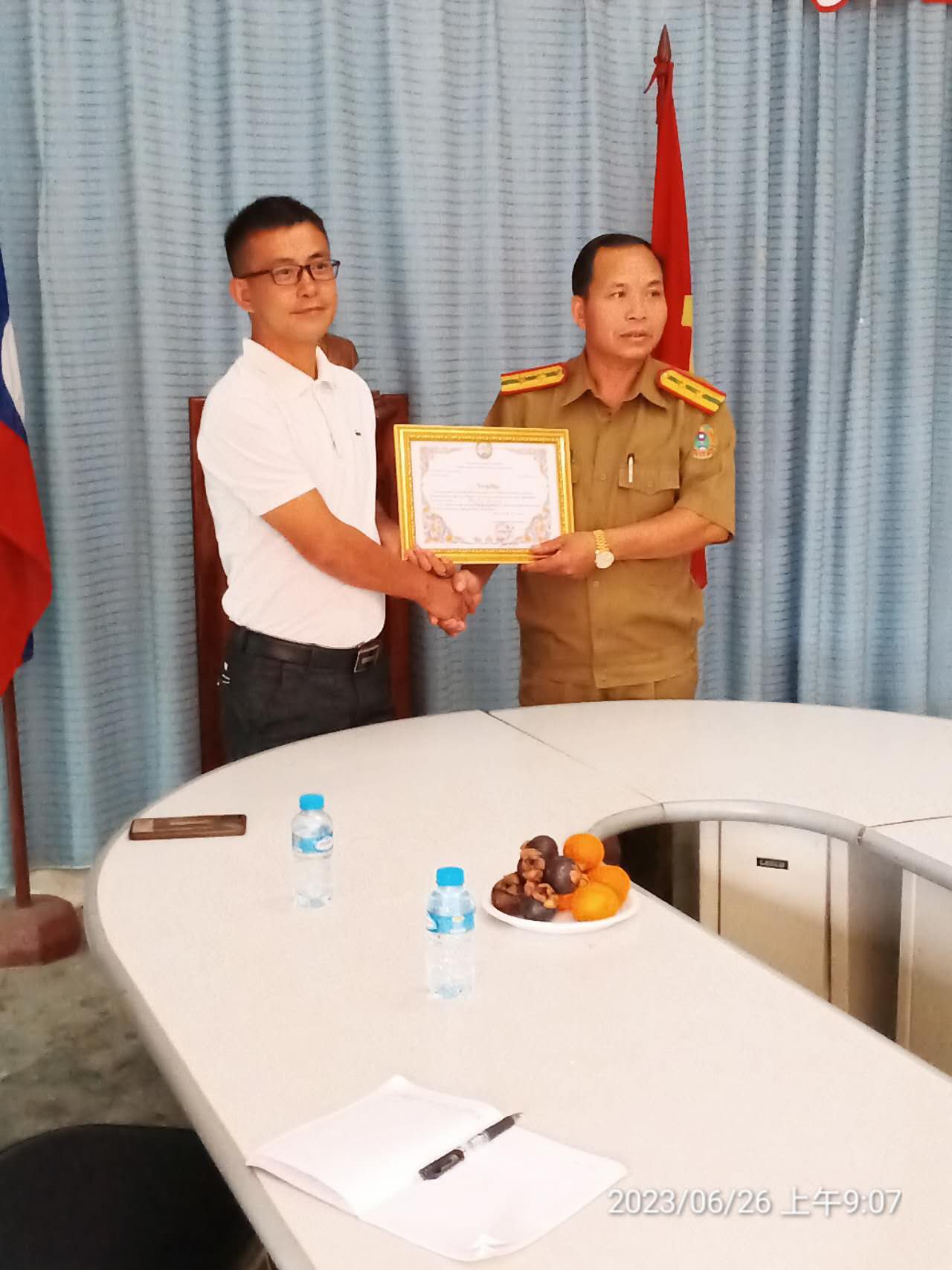 禁毒宣传活动结束后,公司向老挝丰沙里公安厅捐赠多项毒品联合检测试剂盒和用于禁毒办公电脑,丰沙里公安厅厅长康江·辛拉瓮等人员参加了出席捐赠仪式。