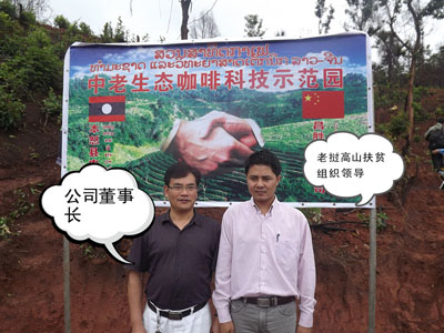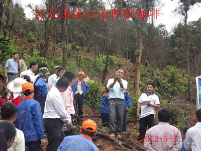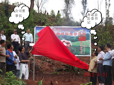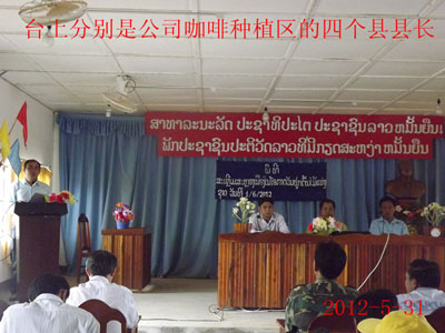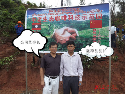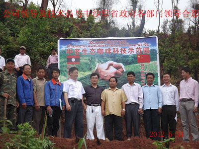 2012年5月31日公司举行了“中老咖啡科技示范园”挂牌仪式活动,公司董事长尹新华、总经理吴建新出席了此次活动,其中丰沙里省计划投资厅副厅长、老挝高山扶贫组织领导、奔诺县县长、县委书记及各部领导、丰沙里省其余各个县领导特意参加了此次活动,并对公司未来的发展和公司为当地姓所做的贡献给予了大力的支持和充分的肯定,活动分三部分举行:第一,上午老挝时间八点整,在奔诺县政府举行“中老生态咖啡科技示范园”挂牌仪式会议;第二,公司领导、老挝方面各部门领导及其余与会人员参加“中老咖啡科技示范园”揭牌仪式的活动现场和参观公司的苗圃基地;第三,活动后的午餐会。