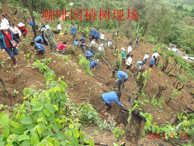 当地学生、技术员和各部门领导共同在这片示范基地上种植致富的咖啡。